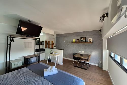 Hotel Biena Ibirapuera UH-1101のお部屋にはデスク、薄型テレビ、専用バスルーム、ベッドリネン、タオルが備わります。この宿泊施設のお部屋にはそれぞれエアコンとワードローブが備わります。